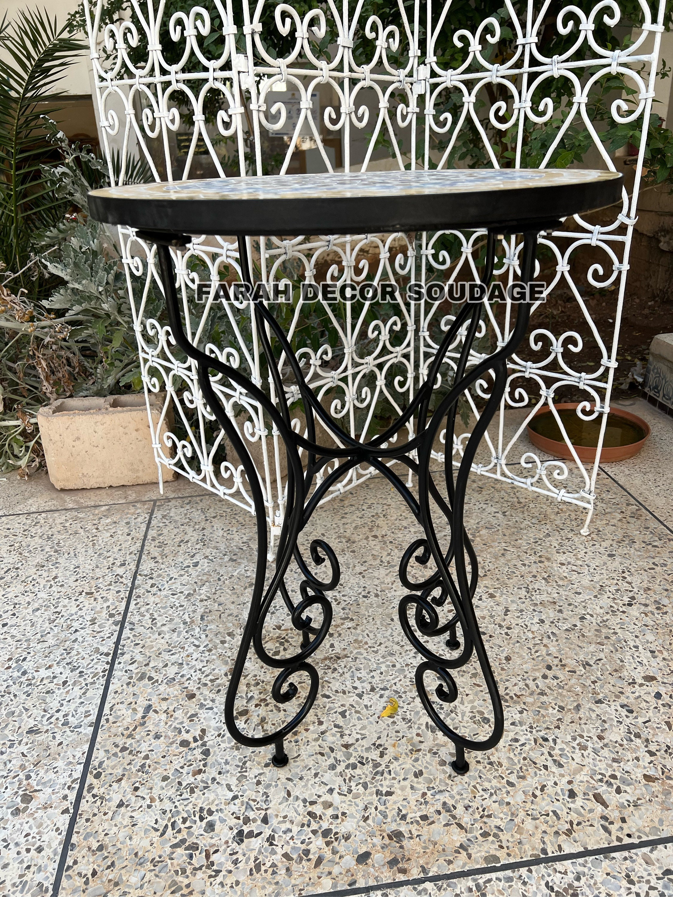 -This mosaic table is traditionally handcrafted in Morocco. The mosaic plate is placed loosely on the table frame. Due to its high weight, the plate is stable on the base.