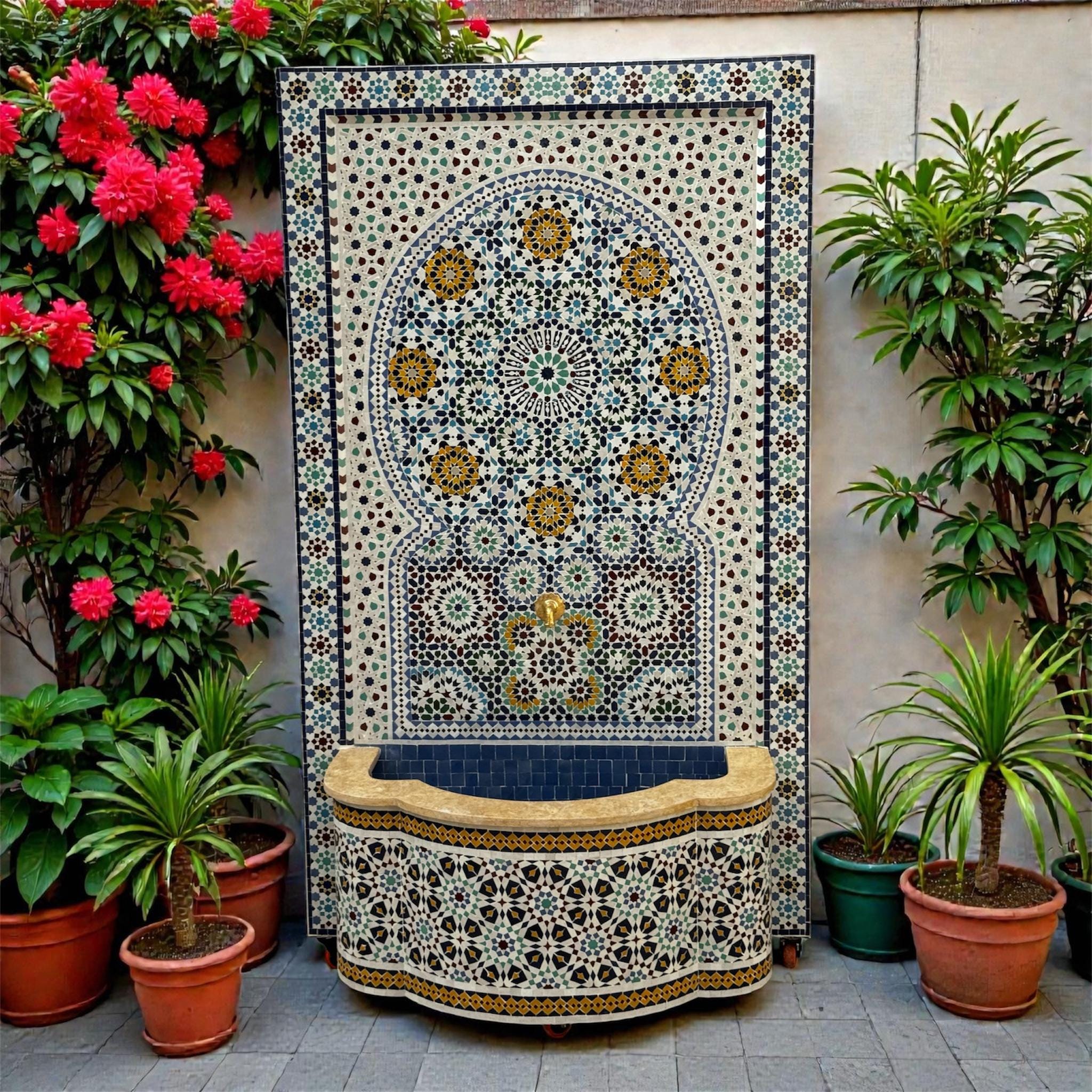 Large Wall Mosaic Water Fountain – Handmade Moroccan Zellige Outdoor Fountain – Luxury Garden & Courtyard Water Feature – Mid Century Moorish Decor