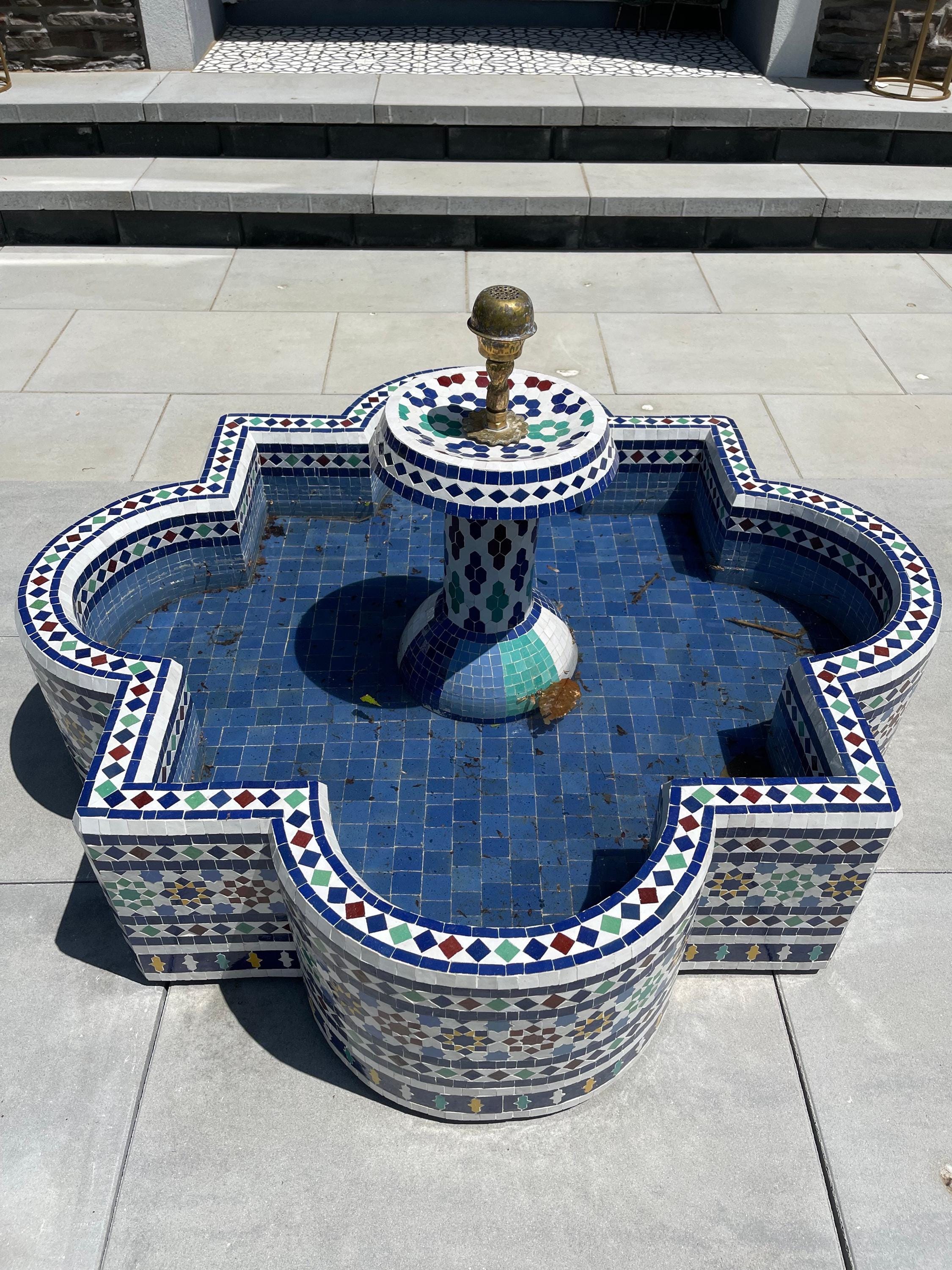 This handmade Moroccan floor fountain is crafted using traditional Moroccan zellige mosaic, inspired by authentic North African architecture. Designed as a ground fountain, it adds an elegant and timeless touch to entryways, patios, courtyards, and garden spaces.
