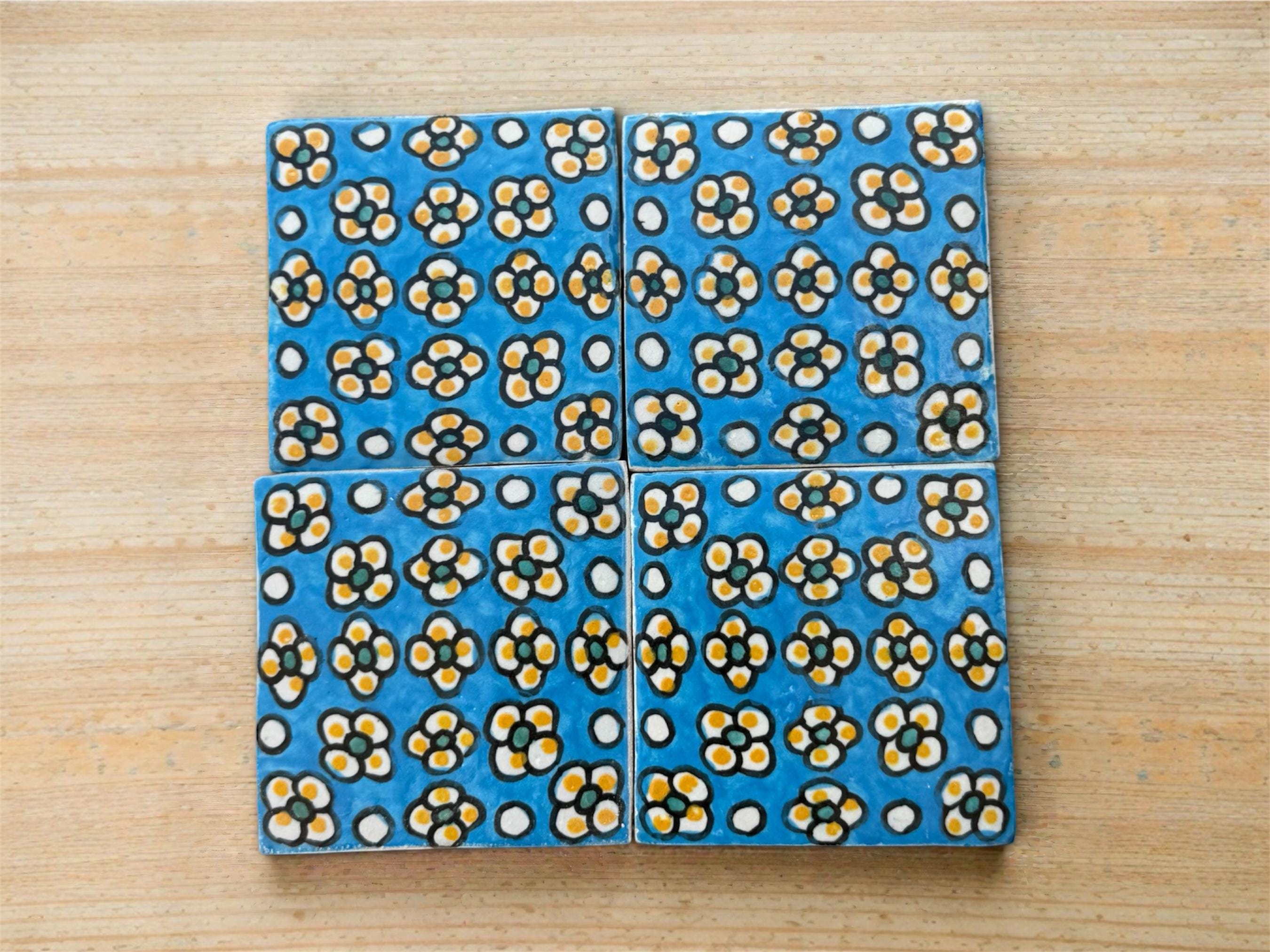 Handmade Moroccan Floral Zellige Tiles - Blue Terracotta for Wall & Backsplash - Morrish Tile .