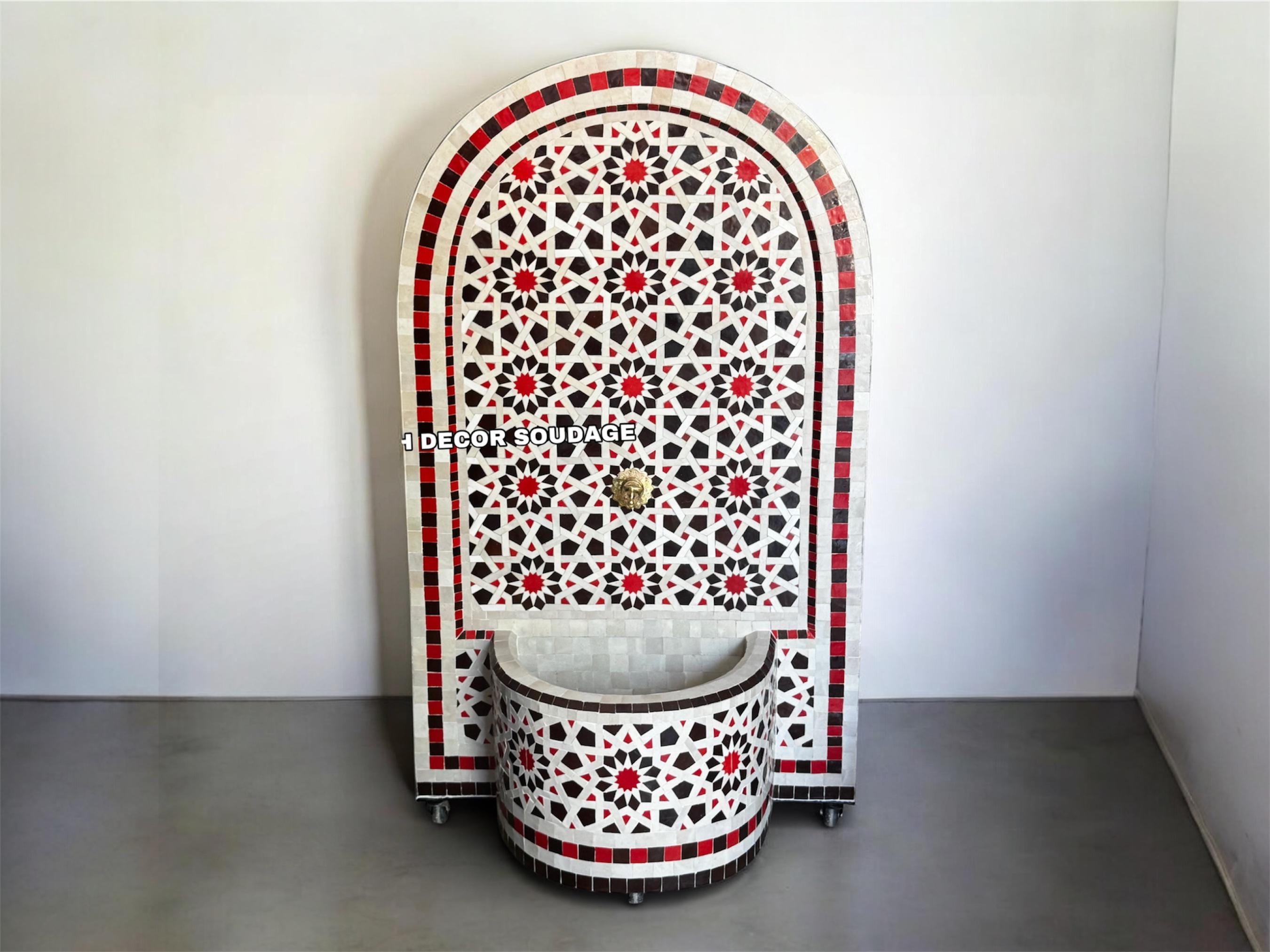 Each fountain is carefully handcrafted by skilled artisans using individually hand-cut mosaic tiles arranged in intricate geometric patterns. This detailed process ensures every piece is unique and represents the rich artistic heritage of Morocco.