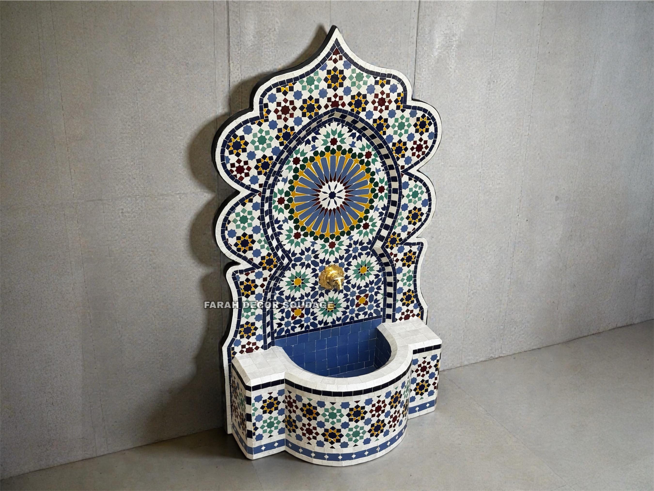 Bring authentic Moroccan elegance and timeless craftsmanship to your home or garden with this handmade mosaic wall fountain. Carefully crafted by skilled artisans in Fez, Morocco, this decorative water feature showcases traditional Zellige and ceramic tile techniques passed down through generations.